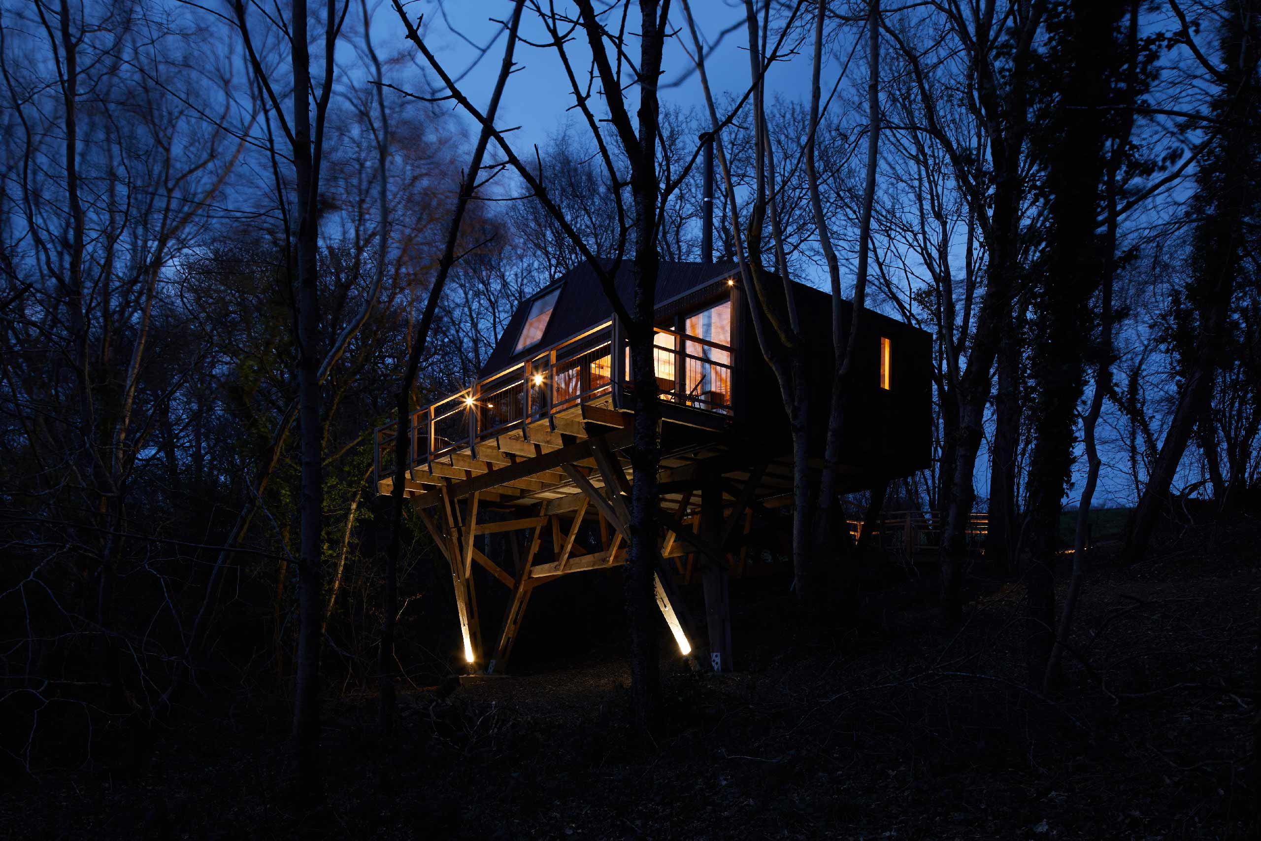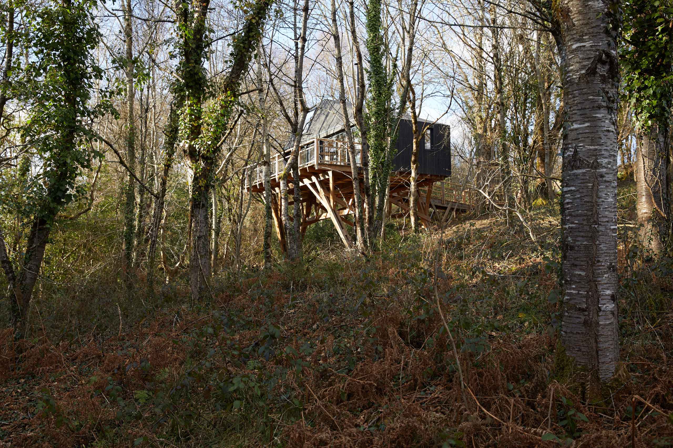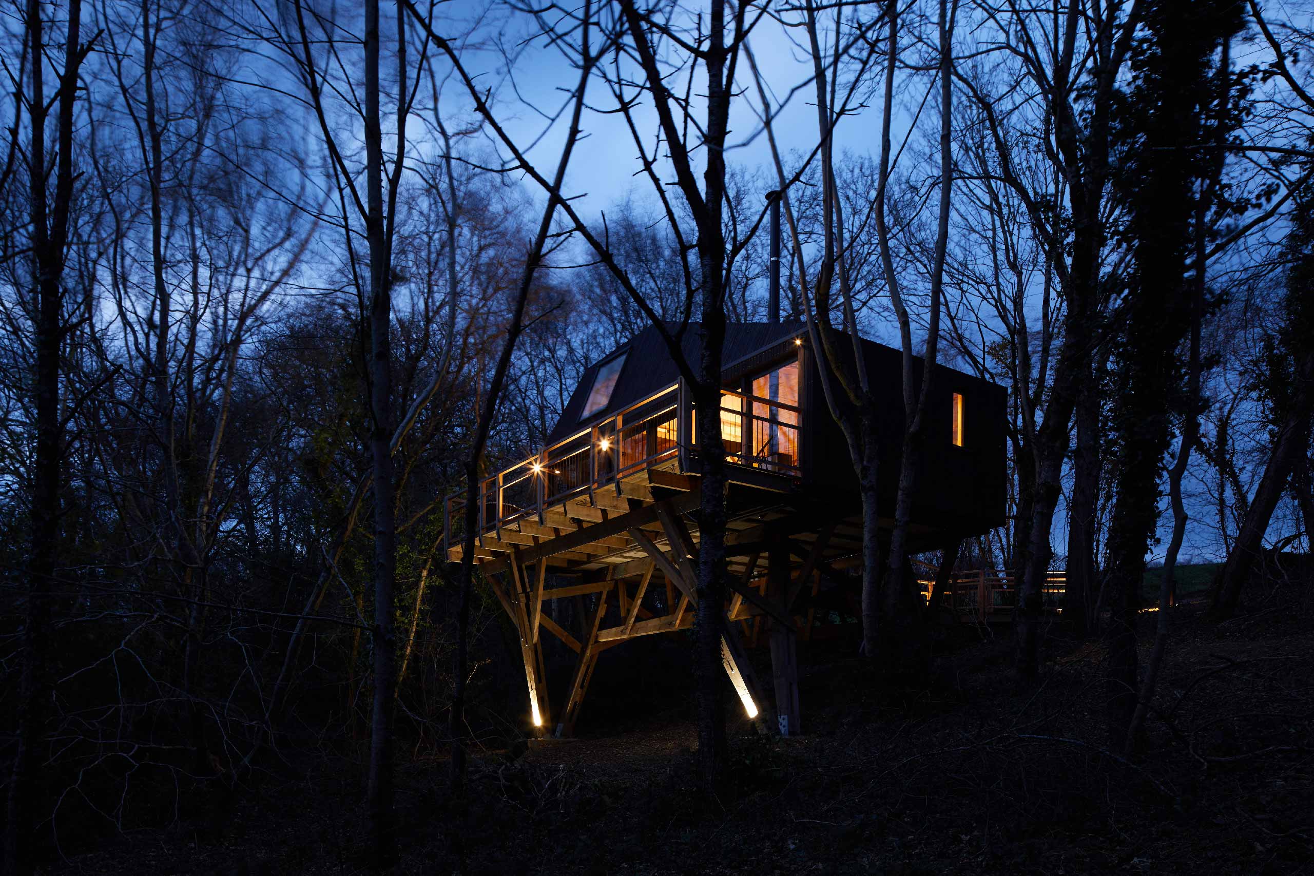 A modern luxury treehouse cabin, high in the tree canopy with uninterrupted views over the rolling Devon countryside.