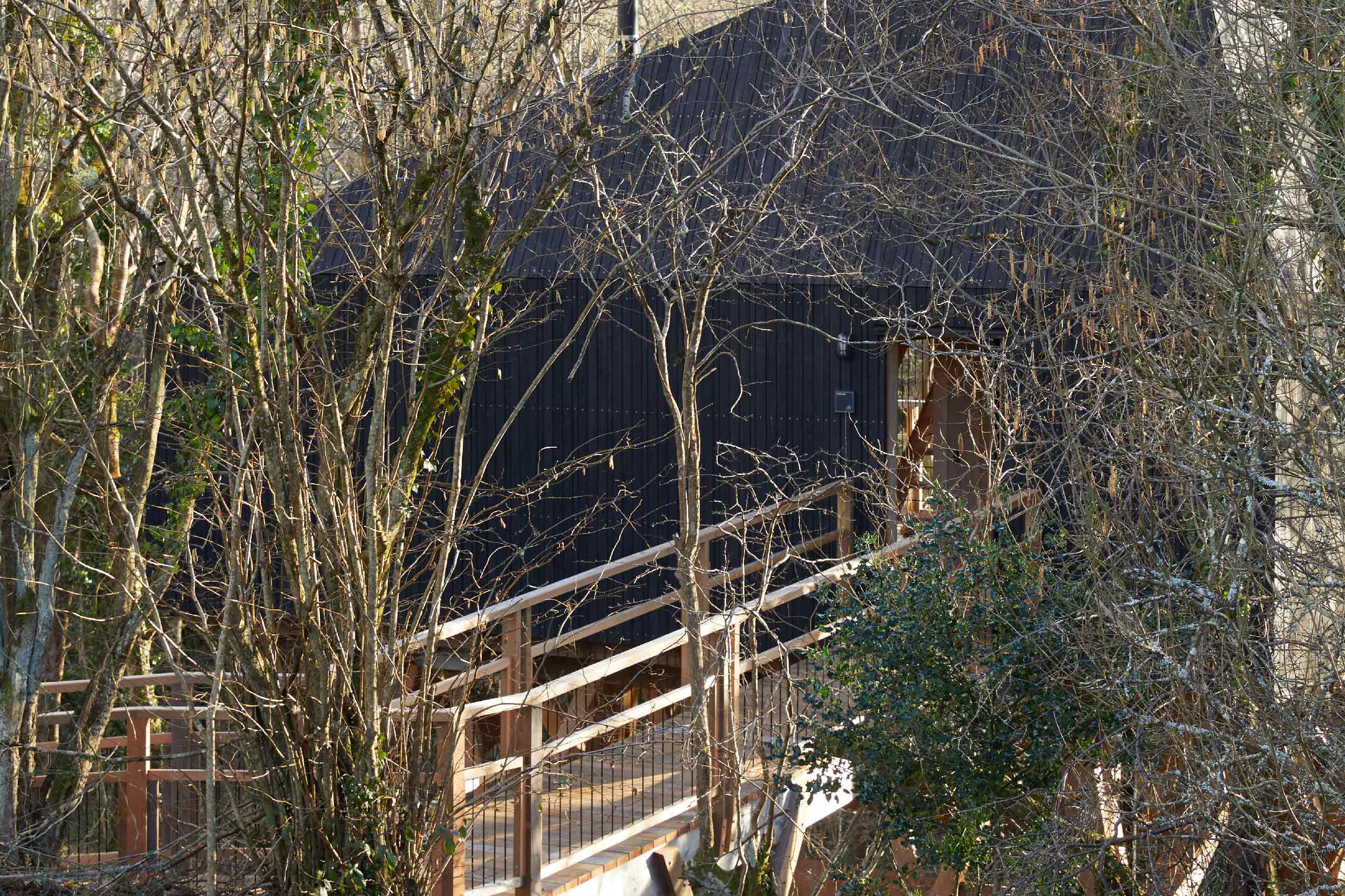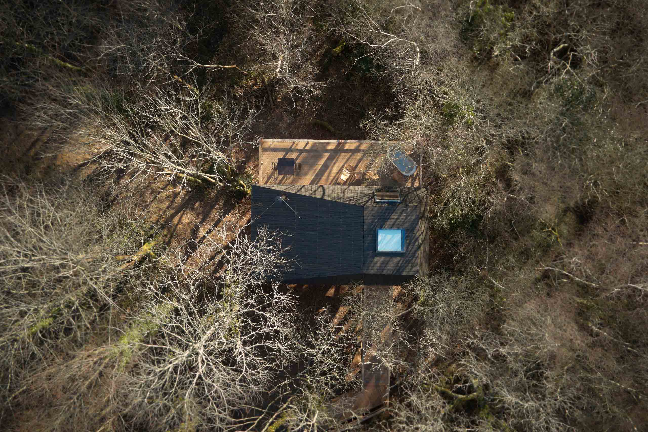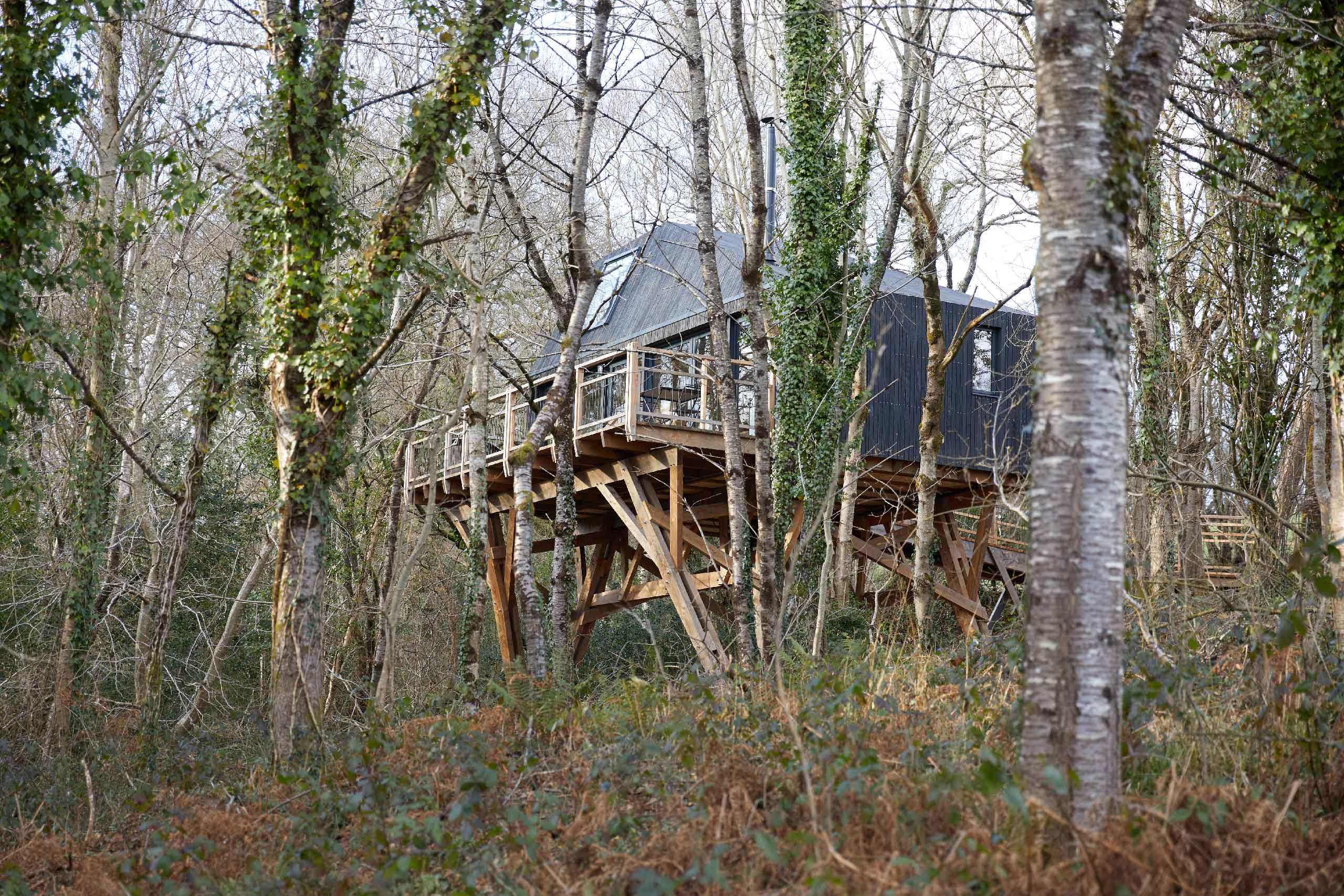 A modern luxury treehouse cabin, high in the tree canopy with uninterrupted views over the rolling Devon countryside.